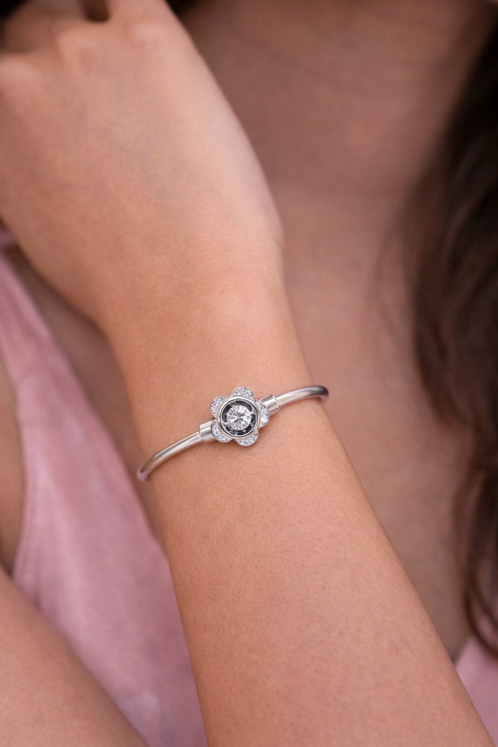Add a touch of elegance to your everyday style with this beautifully crafted Floral Sparkle Silver Bracelet. Designed with a delicate flower motif and a shimmering center stone, this bracelet reflects grace and sophistication.