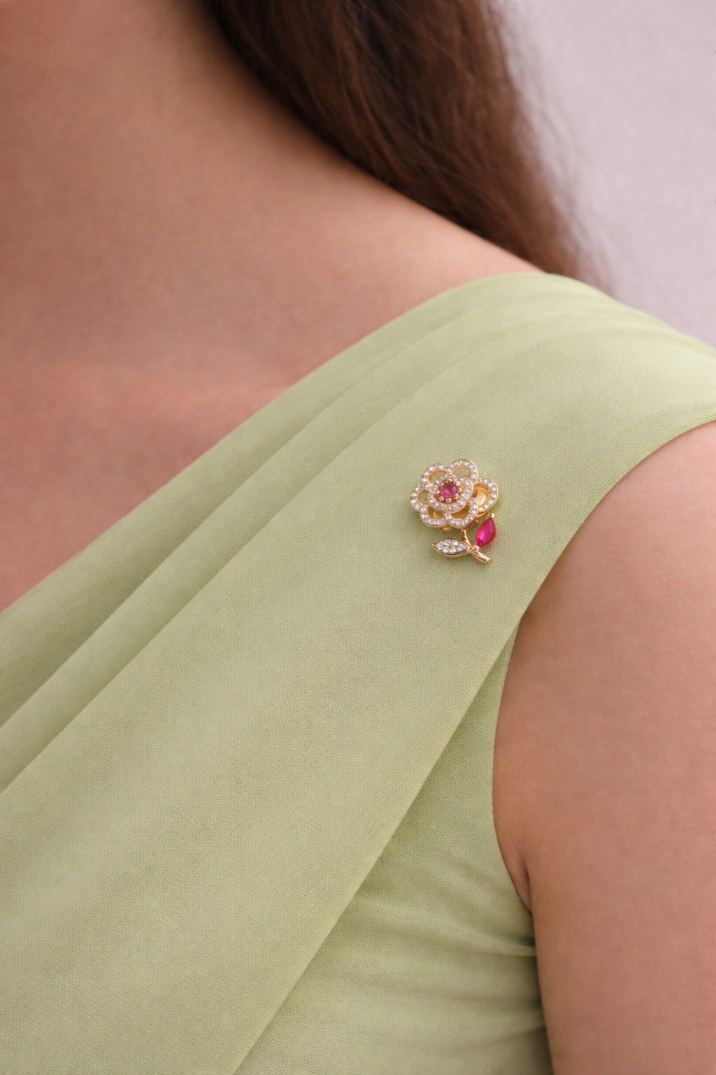 Embrace timeless elegance with this stunning Rose Brooch crafted to perfection. The floral design sparkles with brilliant white stones arranged in a blooming rose silhouette, while a vivid pink gemstone at the center and leaf adds a captivating pop of color.