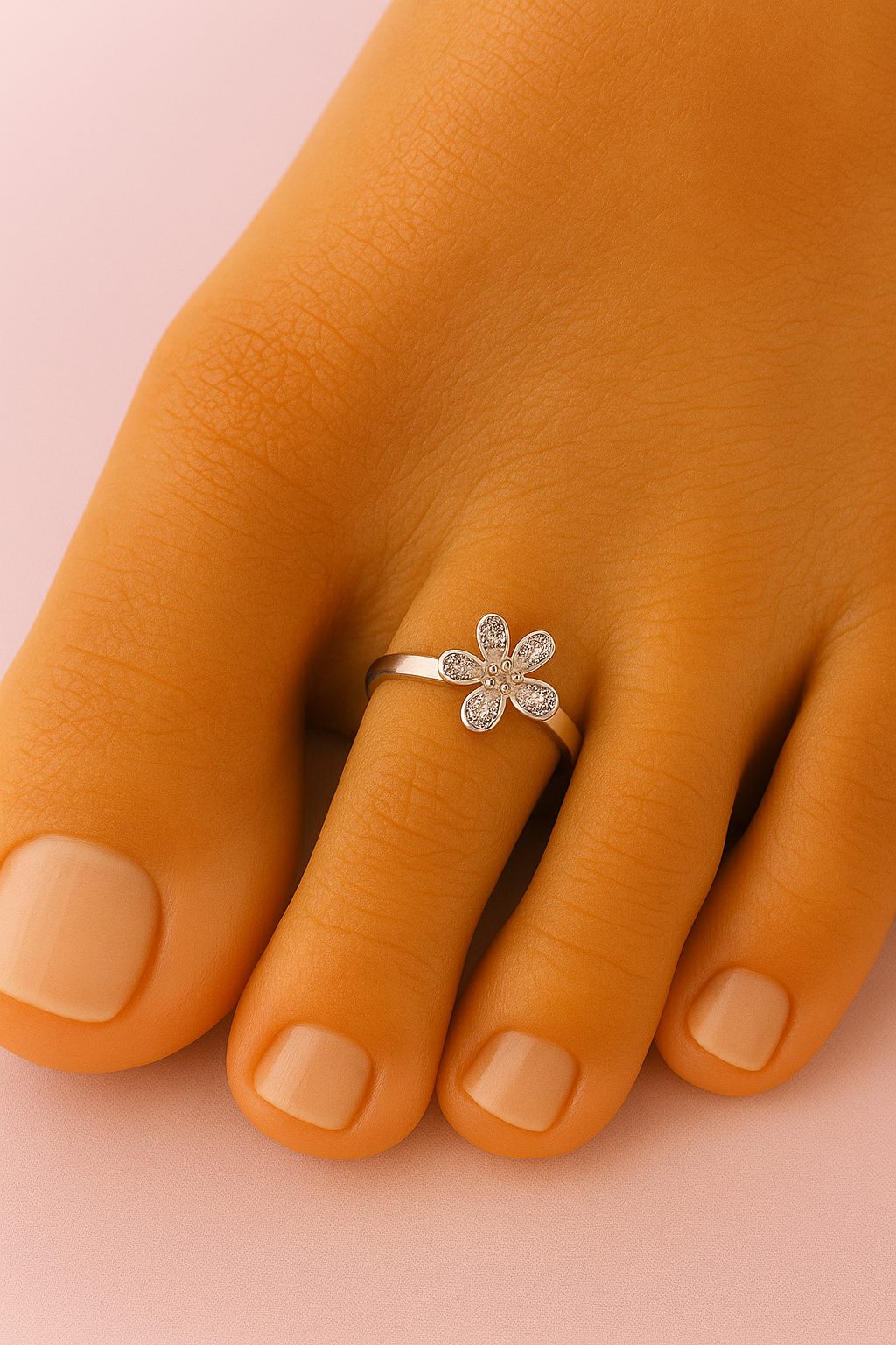 Celebrate effortless elegance with this beautifully crafted Silver Floral Toe Ring, designed to add a touch of sparkle to every step. The ring features a charming five-petal blossom, intricately set with shimmering micro-stones that catch the light with every movement.