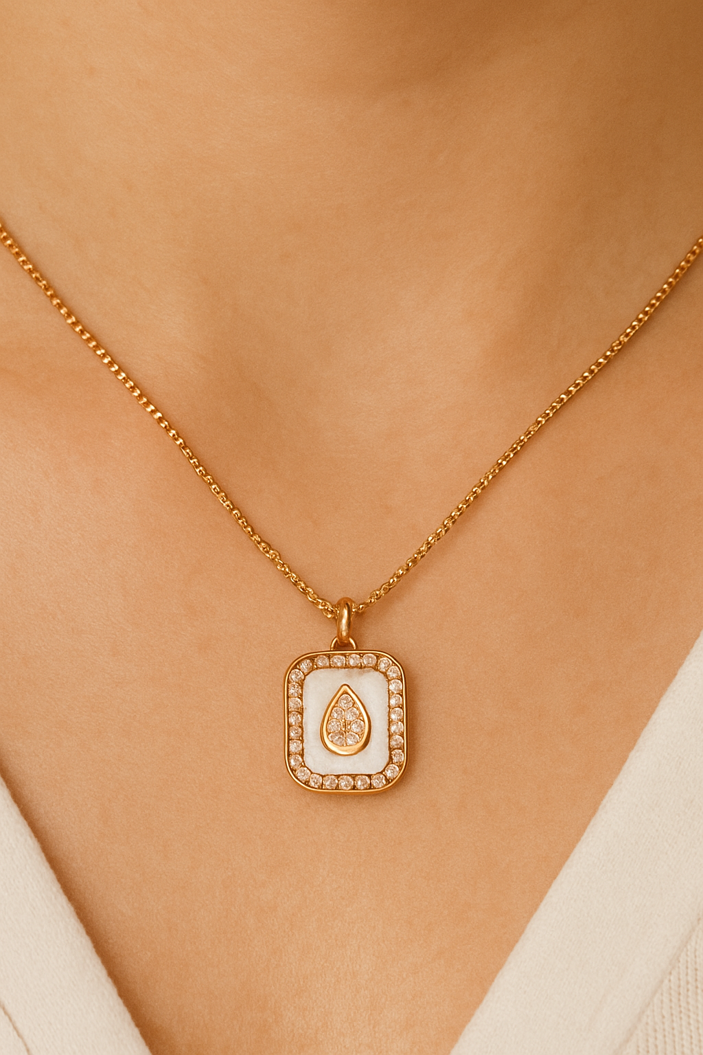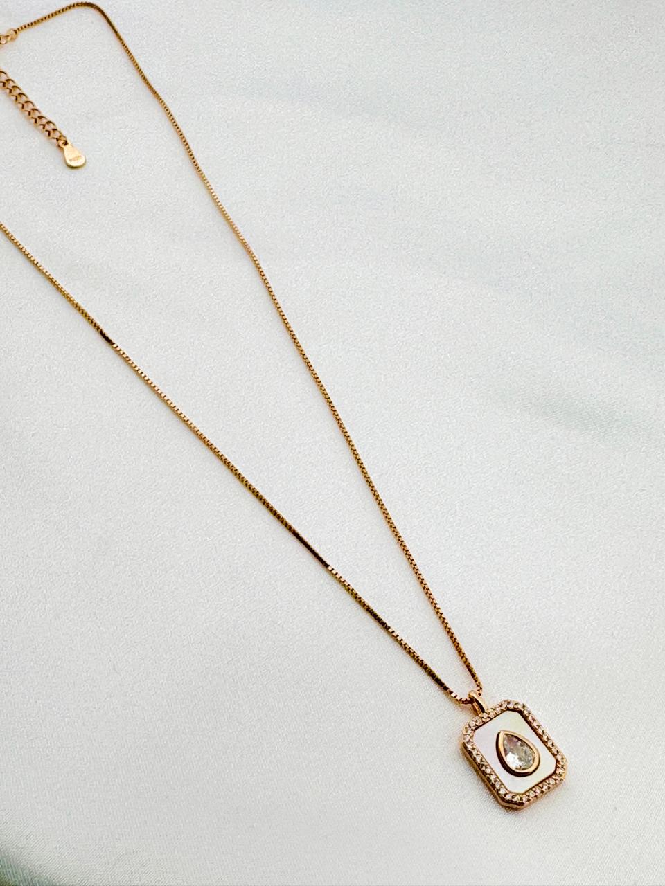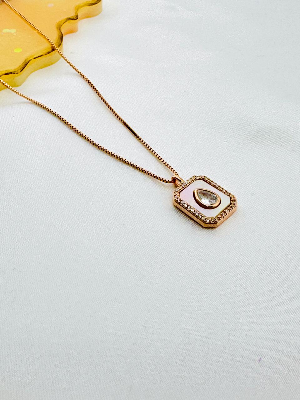 Grace meets modern minimalism in the Dewdrop Elegance Pendant. This exquisite piece features a delicate rose gold chain holding a rectangular pendant with soft, rounded edges. At its heart lies a teardrop-shaped crystal gracefully set on a pale enamel base, surrounded by a fine border of shimmering stones.