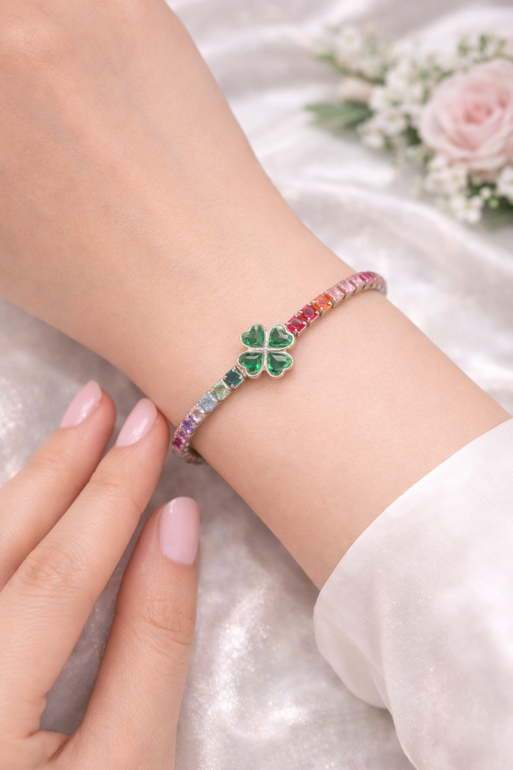 Celebrate colour and elegance with this Emerald Clover Rainbow Bracelet, beautifully crafted with vibrant multicolour stones arranged in a stunning rainbow pattern. The highlight of this bracelet is the charming emerald green clover centerpiece, symbolizing luck, beauty, and positivity.