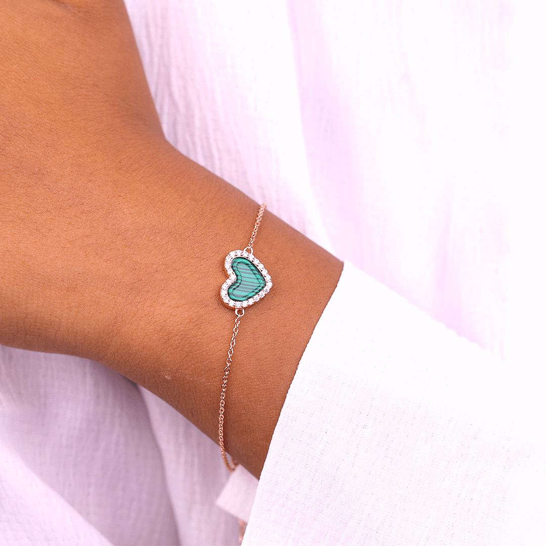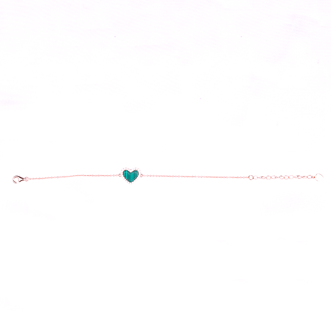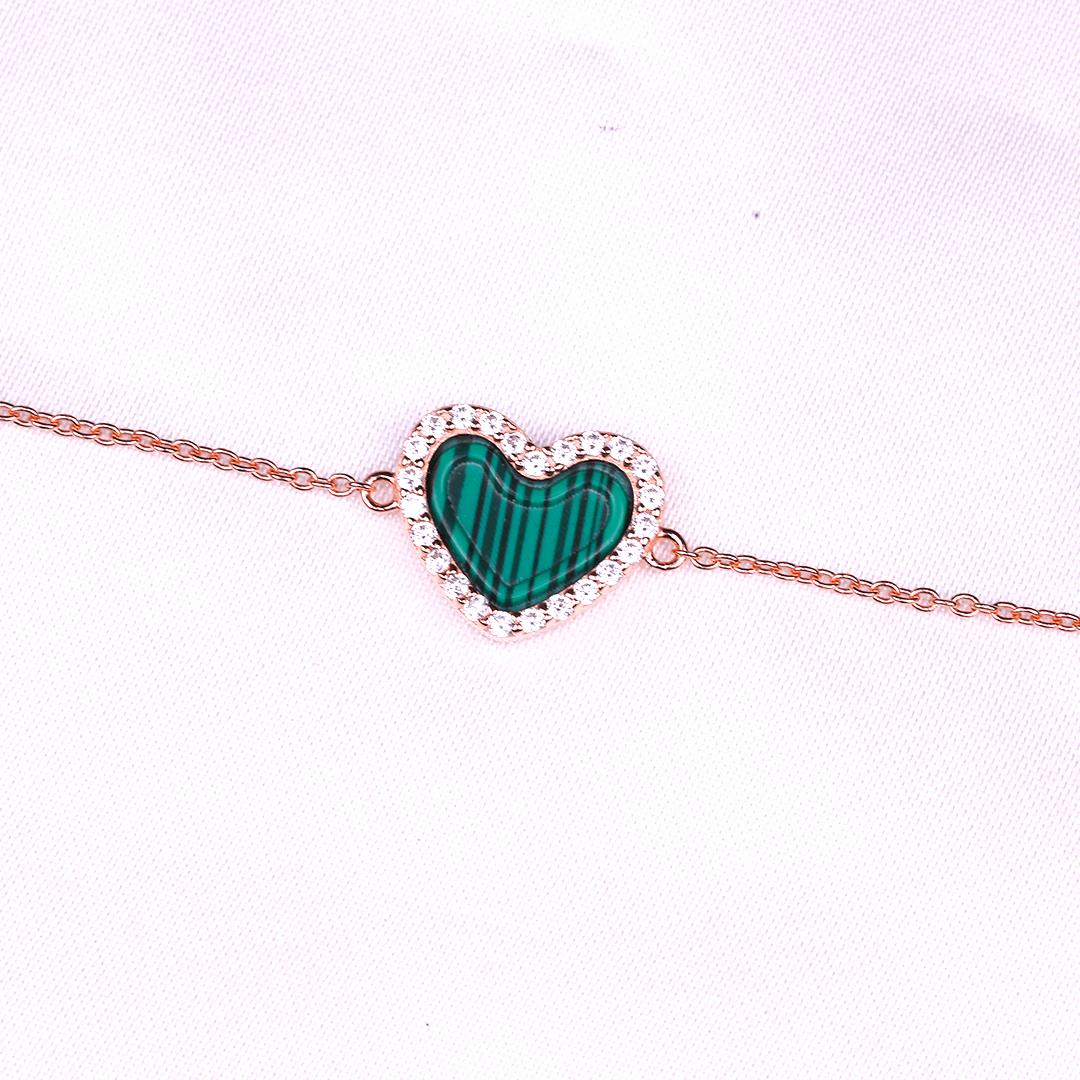 A timeless expression of love, the Emerald Love Heart Bracelet blends romance with elegance. Crafted in a delicate rose-gold chain, it features a striking green enamel heart framed with sparkling stones — symbolizing love, passion, and everlasting devotion.