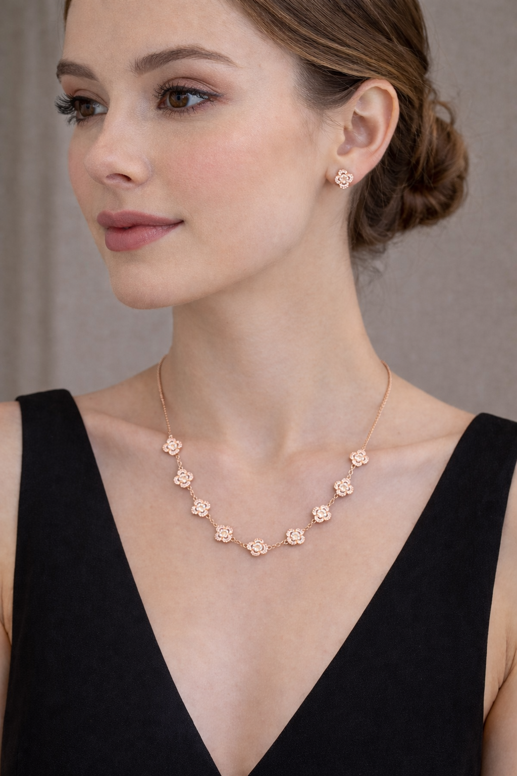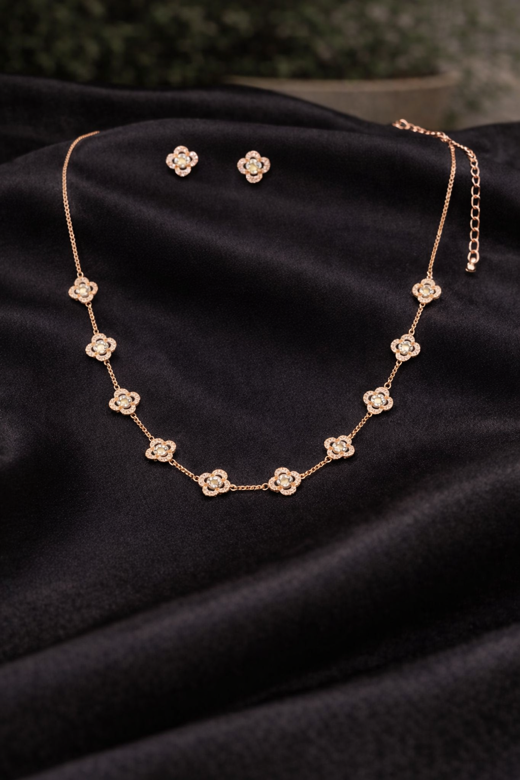This Rose Gold Floral Necklace is a graceful expression of elegance and balance. Featuring nine delicately crafted floral motifs, evenly spaced along a fine rose gold chain, the design offers a harmonious blend of sparkle and sophistication.