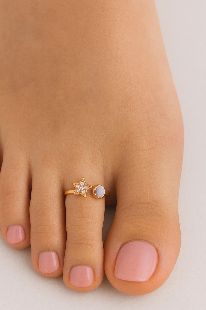 Add a celestial touch to your feet with this Golden Twin Star Toe Ring Set. Designed in a radiant rose gold finish, these toe rings feature a charming blend of star and circular motifs—one adorned with sparkling cubic zirconia stones and the other with a glossy enamel accent.