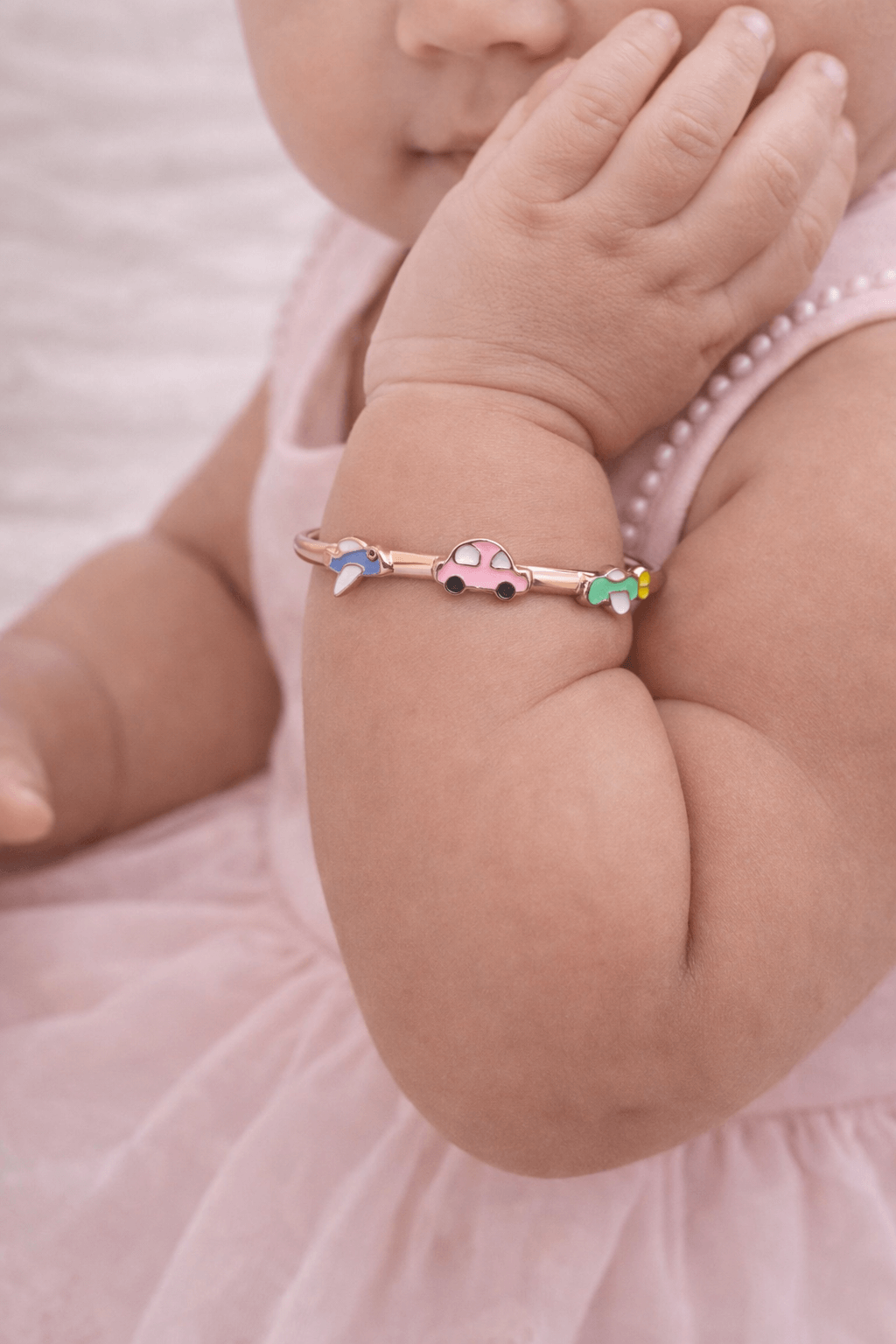 Add a touch of cuteness and charm to your little one’s style with this adorable Kids Rose Gold Baby Bangle. Designed with playful enamel charms like a tiny car and airplane, this bangle perfectly captures the joy and innocence of childhood.