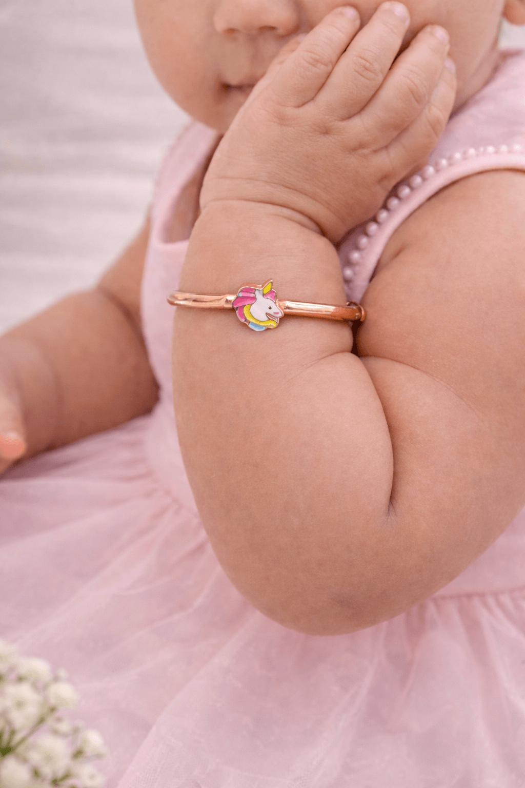 Add a touch of magic to your little one’s jewellery collection with this adorable Unicorn Baby Bangle. Designed in a beautiful rose gold finish, this charming piece features a cute and colourful unicorn motif that kids will absolutely love.