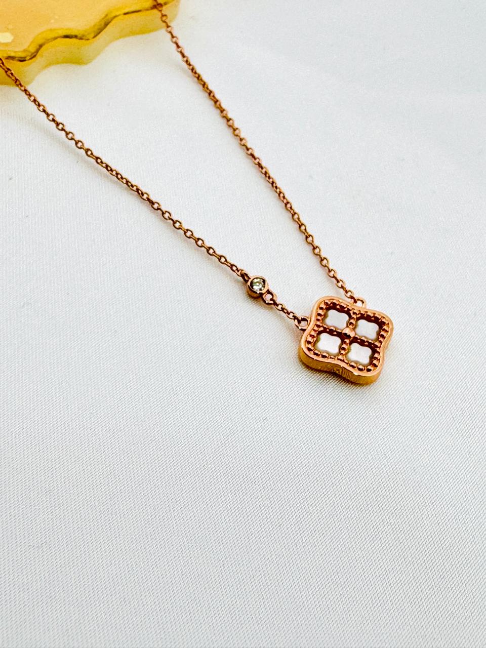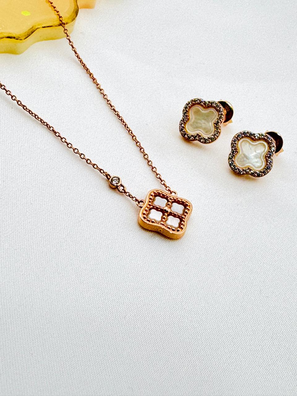 Elevate your everyday elegance with the Luna Clover Set, a timeless blend of sophistication and subtle shimmer. Crafted in rose gold tones, this set features a graceful clover-shaped pendant and matching studs, highlighted with a pearly white enamel inlay and bordered with sparkling CZ stones.