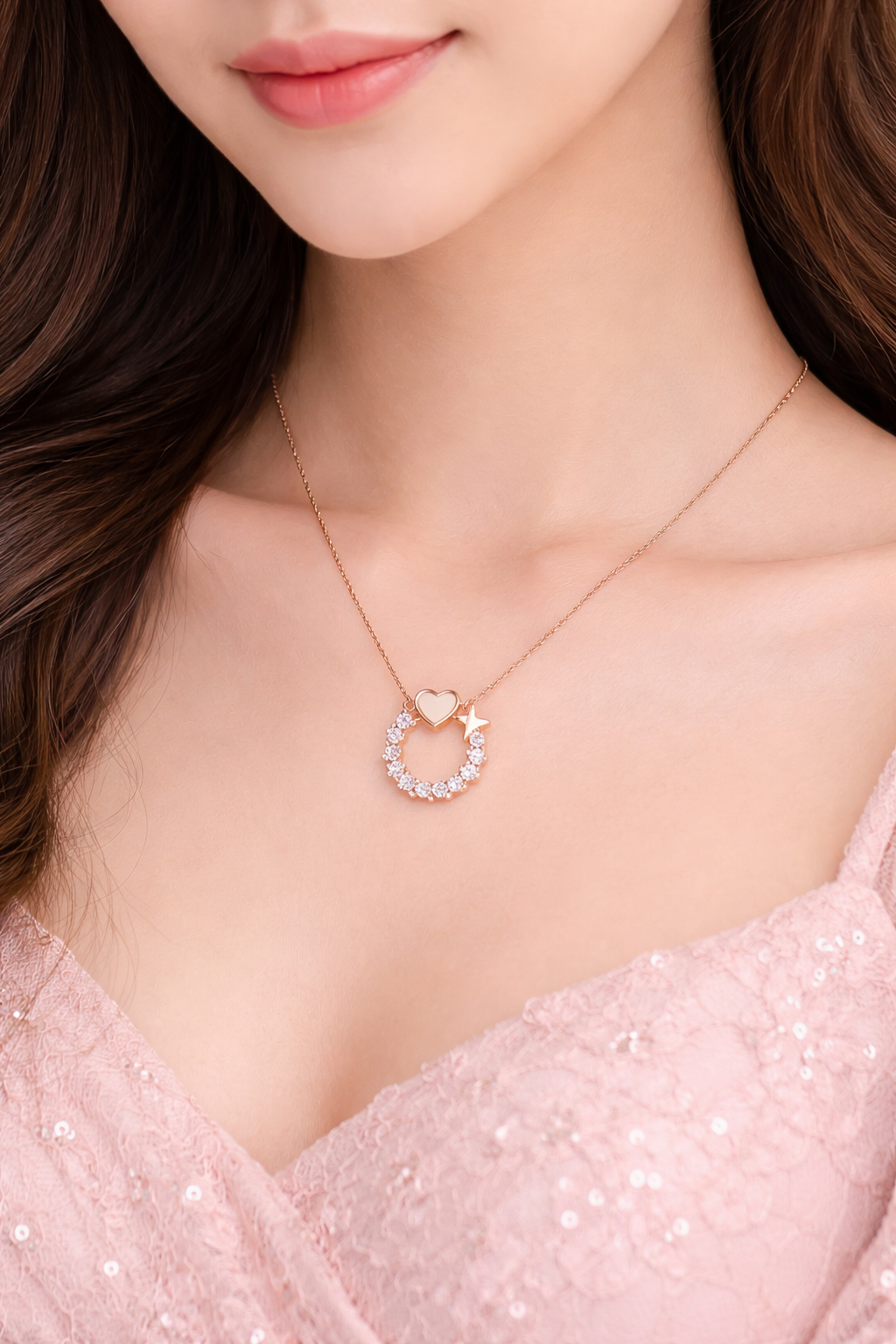 This elegant rose gold finish necklace features a delicate heart motif paired with a sparkling crystal halo, creating a timeless and graceful look. Lightweight and comfortable, this necklace is perfect for everyday wear as well as special occasions. Its minimal yet romantic design makes it an ideal choice for gifting or adding a soft touch of elegance to any outfit.