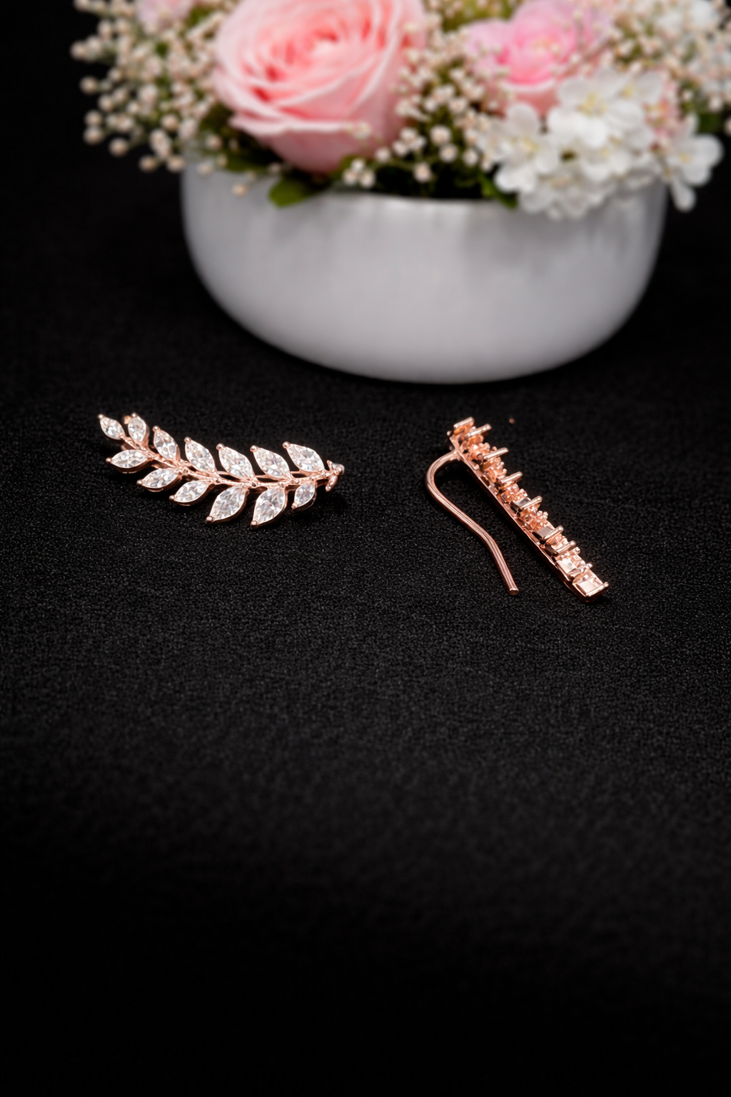 Crafted in a beautiful rose-gold finish, this ear climber features marquise-cut CZ stones arranged like delicate leaves along a vine, hugging the ear with effortless style.