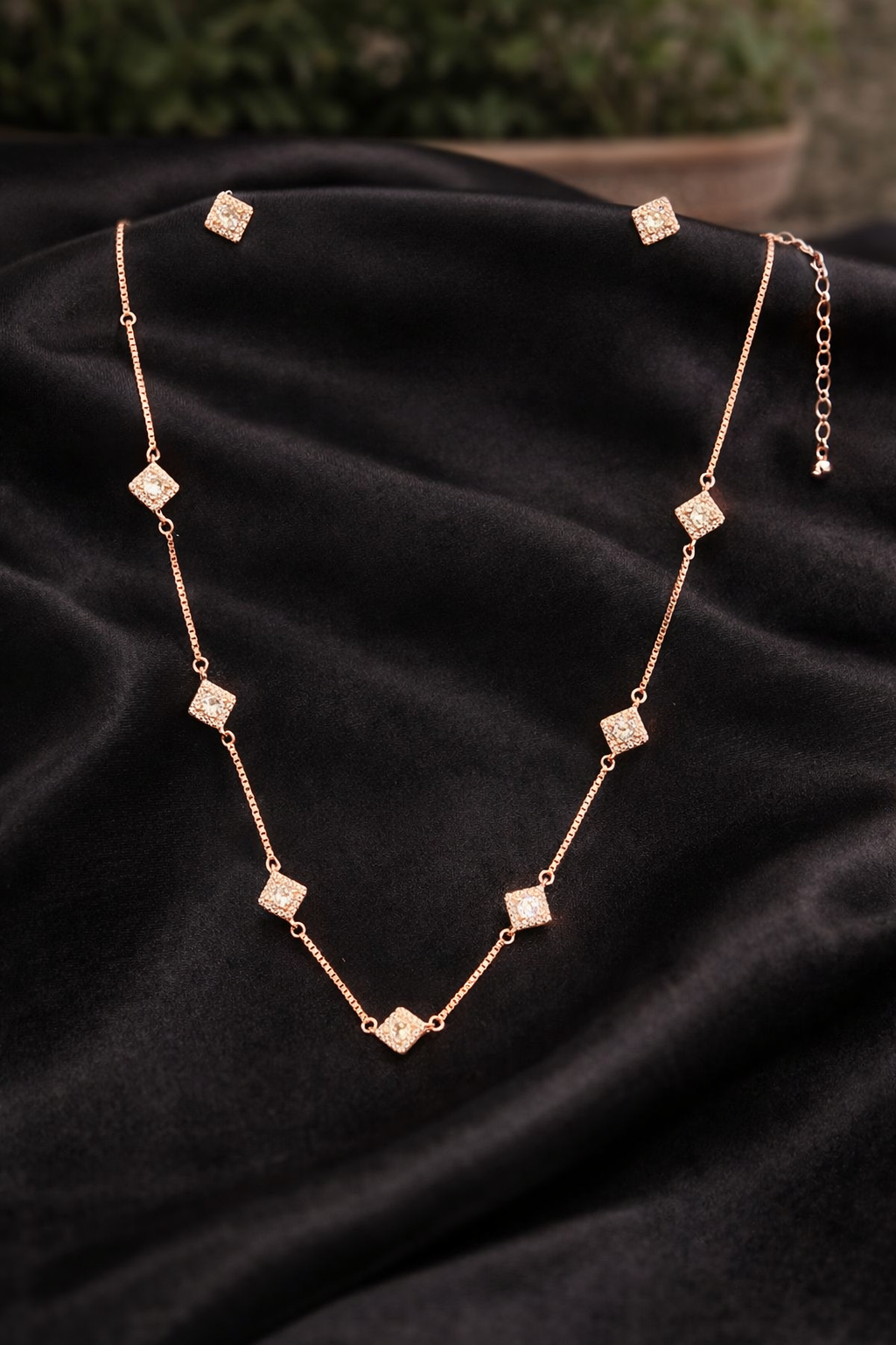 Make a refined style statement with this Rose Gold Finish Diamond Square Motif Necklace Set, designed for effortless elegance. The necklace features evenly spaced square diamond-studded elements linked with a delicate chain, creating a symmetrical and contemporary look.