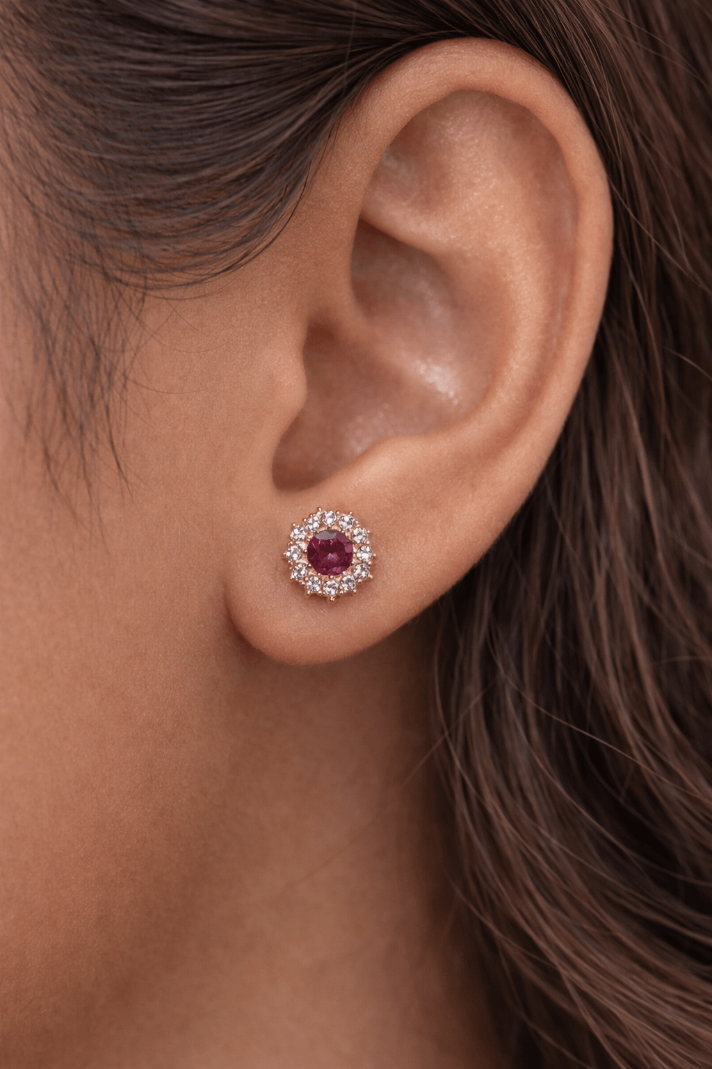 Add a touch of timeless elegance to your jewellery collection with these stunning Ruby Halo Sparkle Stud Earrings. Expertly crafted in 92.5 sterling silver with a luxurious rose gold finish, these earrings feature a vibrant ruby-colored center stone surrounded by a sparkling halo of brilliant crystals.