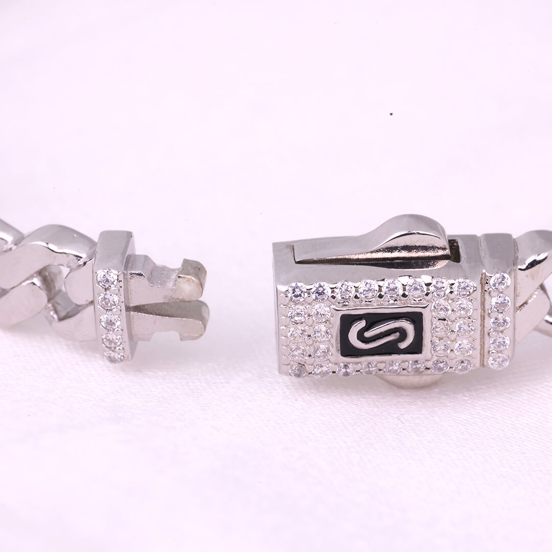 Stand out in style with this Silver Cuban Link CZ Bracelet with Initial Clasp. Designed with a bold Cuban chain pattern and a centerpiece adorned with pave-set cubic zirconia stones, this bracelet combines modern sophistication with timeless appeal.