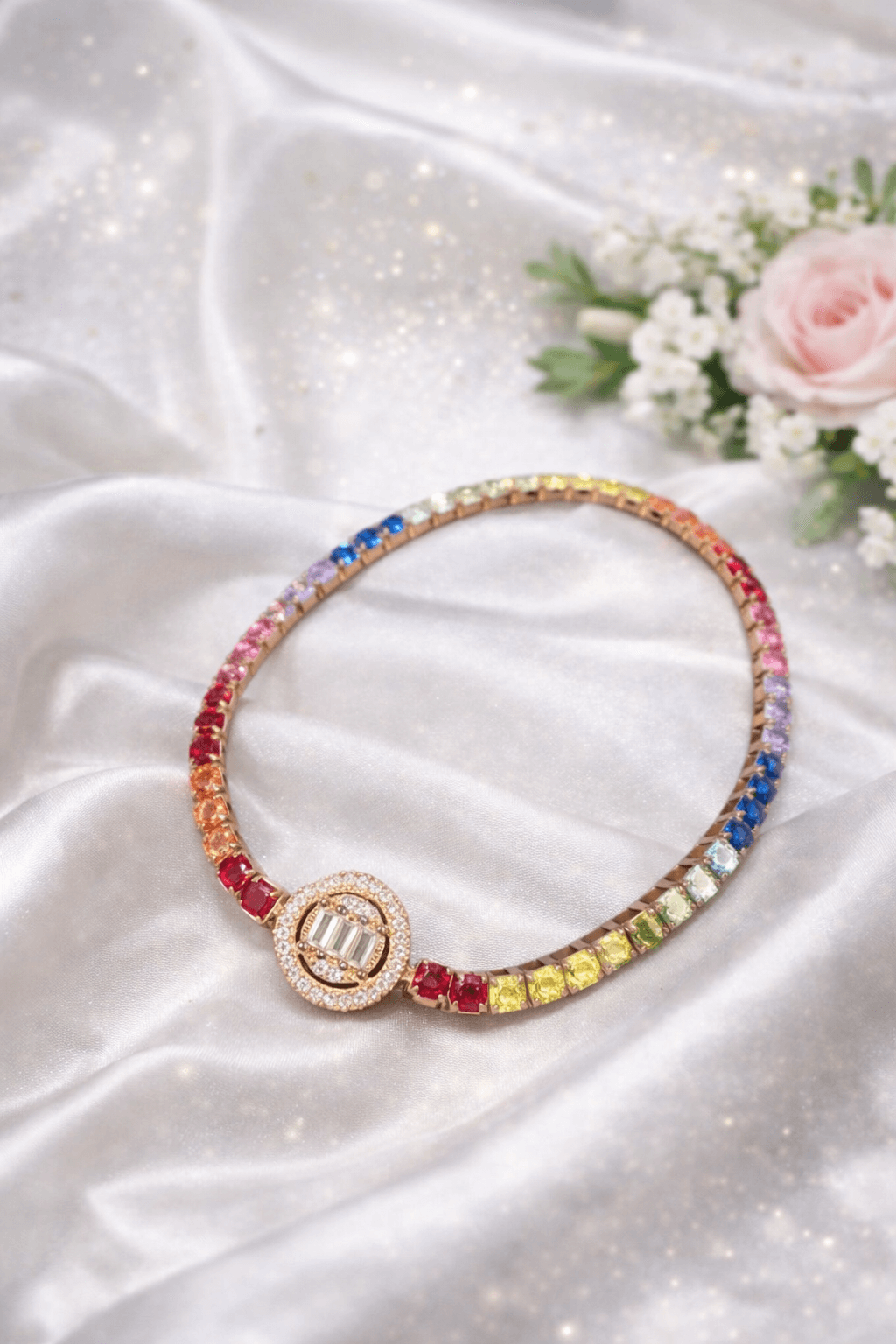 Bring colour and sparkle to your jewellery collection with this Rainbow Halo Bracelet, beautifully designed with vibrant multicolour stones that create a stunning rainbow effect. The elegant round centerpiece with sparkling stones adds a luxurious touch, making it perfect for both everyday elegance and special occasions.