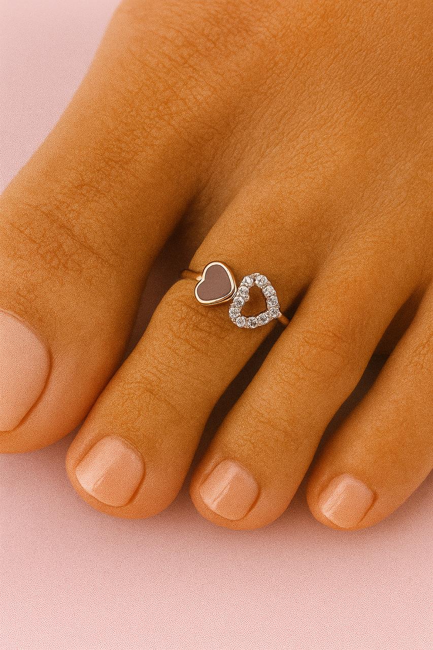 💖 Design: Dual-heart open-front toe rings — one solid blush enamel heart and one open CZ-studded heart.
